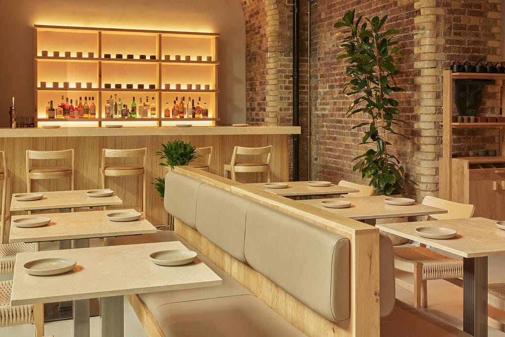 Akara, nestled in Borough Yards near London Bridge, is a contemporary West African restaurant that opened in September 2023. The design, by London-based studio A-nrd, features a calming cream colour palette, light oak, natural stone, and minimalist accents, complementing the 'under the arches' location. The restaurant offers a relaxed dining atmosphere with an open kitchen and Afrobeats music, enhanced by friendly, attentive service. It's a spacious 40-cover establishment, avoiding a cramped feel.